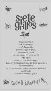 El ciclo cultural Siete grillos sigue creciendo y sumando novedades, y a las presentaciones semanales de los jueves se van agregando detalles. Así lo confirmó Gustavo Hernandez, quien anticipó que hoy estará acompañado por Noe Rojas, profesora de música con una hermosa voz, con quien lograron un excelente trabajo en los ensayos. La propuesta es un repertorio de tangos, con el acompañamiento de Gustavo Hernandez con música de Maderna y un poema de Cortázar sobre cómo escuchar la música. La presentación será en El conventillo, Gorriti 570, desde las 21 horas y como siempre, hay servicio gastronómico para antes o después del show. Dentro de las novedades, Gustavo Hernandez anunció una edición de los bises, para este sábado, con la participación de Natalia Leguizamón y Graciela Di Ferdinando; recordando además que la próxima semana se realiza el sorteo de premios entre los asistentes del mes; y anunció que en el mes de abril, comienza el ciclo en Trenque Lauquen, donde la semana anterior tuvo su primera actuación como presentación del ciclo, con un muy buen resultado.