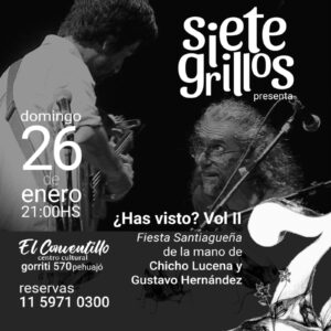 El responsable del ciclo cultural Siete grillos, Gustavo Hernandez, recordó que este fin de semana y en la edición folklórica del ciclo, realizará una pequeña gira regional. Destacó que en lo personal es un momento emotivo importante, ya que se trata del reencuentro con quien fue su alumno en la UCA y luego un amigo, Chicho Lucena, y aprovechando su viaje a Buenos Aires se armó un show de fiesta santiagueña denominada “Has visto”, con acento santiagueño; que se presenta hoy en Carlos Casares, mañana en Nueve de julio y el domingo en Pehuajó.