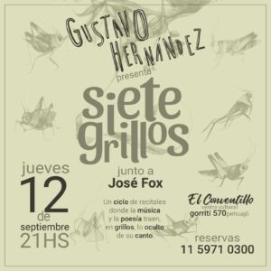 Gustavo Hernandez, responsable del ciclo cultural Siete grillos, confirmó la presentación de hoy en El conventillo (Gutierrez 576), acompañado por José Fox, quien presentará un repertorio de música lírica, que siempre se la asocia a la música clásica, pero simplemente son letras diferentes que se cantan y cuentan de forma diferente. El acompañamiento llegará con algunas canciones que vienen a responder los mensajes de los 7 grillos del invitando, también buscando entre algo de lo lírico que alguna vez interpretó Gustavo. El espectáculo comienza a las 21 hora, pero las puertas de abren 30 minutos antes, para que la gente se organice y pueda comer y tomar algo.