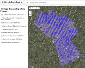 Muestra un 35.24% del partido con agua en superficie y cuando se divide al este y oeste, este primero posee un 45.8% de la superficie afectada, versus un 24.6% más al oeste. Fuente Germán Torrallardona Ing. Agrónomo especialista en Teledeteccion y GIS