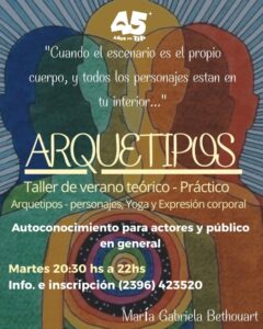 Gabriela Bethouart informó sobre el taller que dictará en el TIP desde mañana hasta el mes de marzo, todos los martes a las 20.30 horas, destinado a personas mayores, no adolescentes, en el que propone abordar los diferentes arquetipos que hacen a una persona, para mejorar su calidad de vida. A través de un trabajo teórico y práctico, con juegos e intercambio y mucho trabajo grupal, la idea es abordar los diferentes aspectos de la personalidad de cada individuo. Dijo que es una tarea que realiza habitualmente en su taller de yoga, y pensó en dictarla en el TIP porque es una herramienta muy importante para los actores, pero decidió abrirlo a la comunidad porque también es útil para que todos puedan tener un mayor autoconocimiento y una mejor calidad de vida. Los interesados en sumarse, pueden comunicarse al 2396 423520.