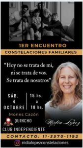 En lo personal, Nidia López manifestó que estaba buscando la manera de hacer algo por los demás, y le resonó la idea de volver al origen, por eso el encuentro será en su Mones Cazón natal, e invitó a quienes quieran sumarse a esta experiencia, aclarando que las constelaciones no son soluciones mágicas, que no resuelven cuestiones de salud que necesitan de la medicina y de terapias, sino que es una herramienta para entender, aceptar y reorganizar nuestro futuro.