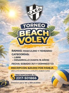 El Profesor a cargo de la actividad, Benjamín Bueno, informó que está abierta la inscripción para participar del primer torneo de beach vóley de la temporada, que se realizará el fin de semana del 31 de enero y el 1 de febrero en el campo de deportes de la institución. El costo de inscripción es de $20 mil por pareja, incluyendo actividad en la pileta los dos días, y habrá premios para primer y segundo puesto. La idea es fomentar el deporte y mantener activos a los jugadores del Club, que se mostraron entusiasmados con la propuesta, aunque es abierta a quienes quieran sumarse; además, se espera que no sea el único torneo que se organice.
