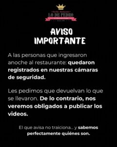 “A las personas que ingresaron anoche al restaurante: quedaron registradas en nuestras cámaras de seguridad. Les pedimos que devuelvan lo que se llevaron. De lo contrario, nos veremos obligados a publica los videos. El que avisa no traiciona… y sabemos perfectamente quiénes son”, publicaron.