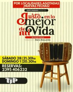 Uno de los integrantes del Grupo Arlequino de Carlos Casares, Darío Basualdo, anunció las últimas dos funciones de “Justo en lo mejor de mi vida” en la sala del TIP, este sábado a las 21.30 horas y el domingo a las 20.30. Contó que el público pehuajense recibió muy bien esta nueva propuesta, con sala llena las dos noches del fin de semana anterior, por lo que surgió la posibilidad de volver a presentarla en dos últimas funciones.