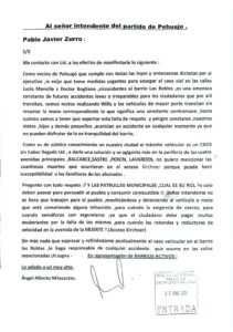 El vecino indicó que en la nota le exige al Intendente tomar cartas en el asunto y lo hace responsable por las consecuencias del caótico tránsito local, asegurando que tiene pruebas para demostrar esa responsabilidad donde corresponda. Indicó que hace 5 meses, un familiar de su esposa perdió la vida en “Acceso ex Avellaneda” dijo, y agregó que ahí siguen ocurriendo accidentes como en toda la ciudad, porque no hay ningún tipo de control ni acción; e invitó especialmente a los vecinos a sumarse a este reclamo, a mostrar sus nombres, apellidos y firmas en este tipo de notas, porque aunque el tránsito lo hacemos entre todos, la responsabilidad del control corresponde al estado Municipal.