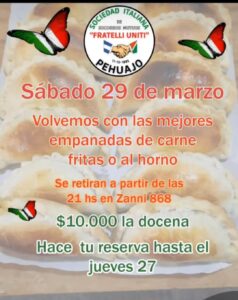 El Presidente de la Sociedad Italiana, Luis Cúneo, informó que este fin de semana vuelven las tradicionales empanadas de la institución, que se pueden reservar hasta el jueves a la noche y se retiran el sábado, desde las 21 horas. Son empanadas de carne fritas o al horno, el valor es de $10000 la docena, y lo recaudado se destina a mantener los gastos de funcionamiento de la institución.